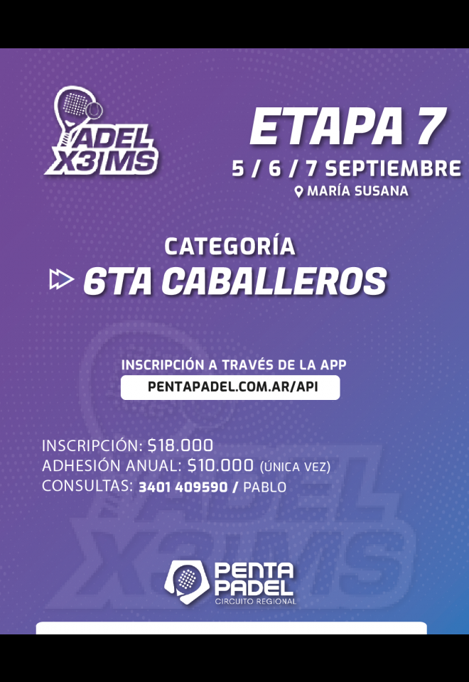 »» Evento: 6TA CAB / 5-6-7 SEPTIEMBRE / ETAPA 7 / PADEL X3 »» Localidad: María Susana »» Fechas: 04/09/2025 al 07/09/2025