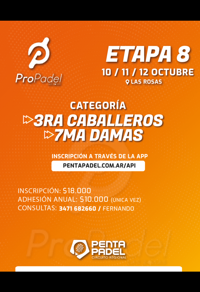 »» Evento: 3RA CAB - 7MA DAM / 10, 11 Y 12 DE OCTUBRE / PRO PADEL / ETAPA 8 »» Localidad: Las Rosas »» Fechas: 10/10/2025 al 12/10/2025