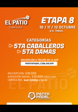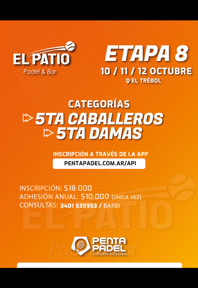 »» Evento: 5TA DAM - 5TA CAB / 10, 11 y 12 DE OCTUBRE / EL PATIO PADEL / ETAPA 8 »» Localidad: El Trébol »» Fechas: 10/10/2025 al 12/10/2025
