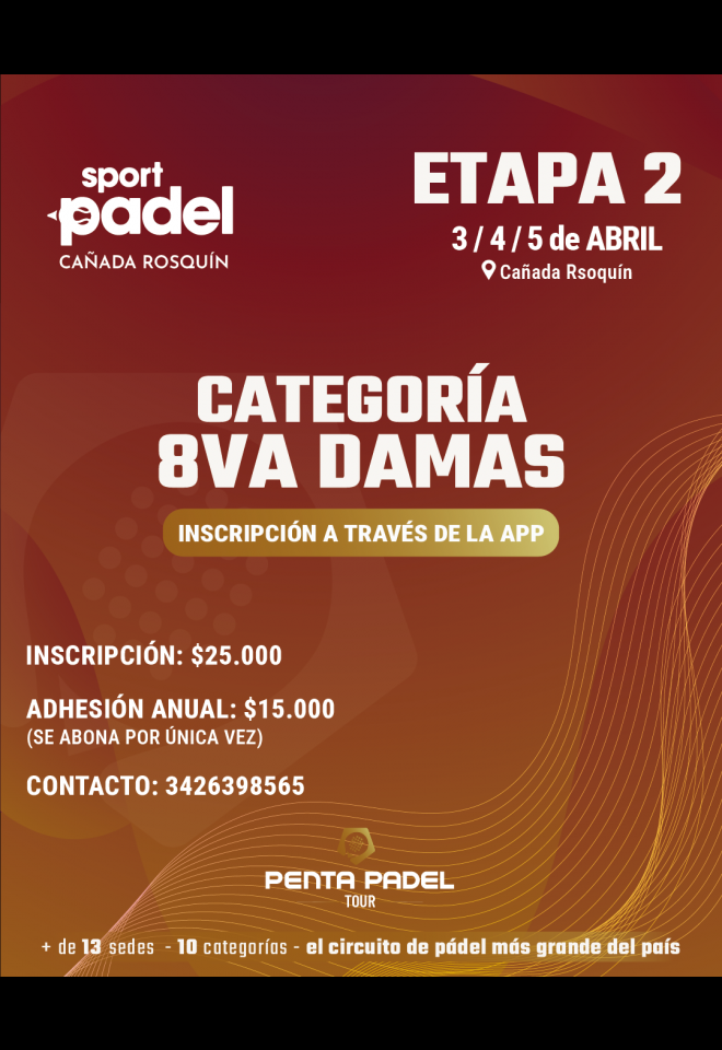 »» Evento: 8VA DAM / 4-5-6 ABRIL / SPORT PADEL CAÑADA / ETAPA 2 »» Localidad: Cañada Rosquín »» Fechas: 02/04/2026 al 05/04/2026