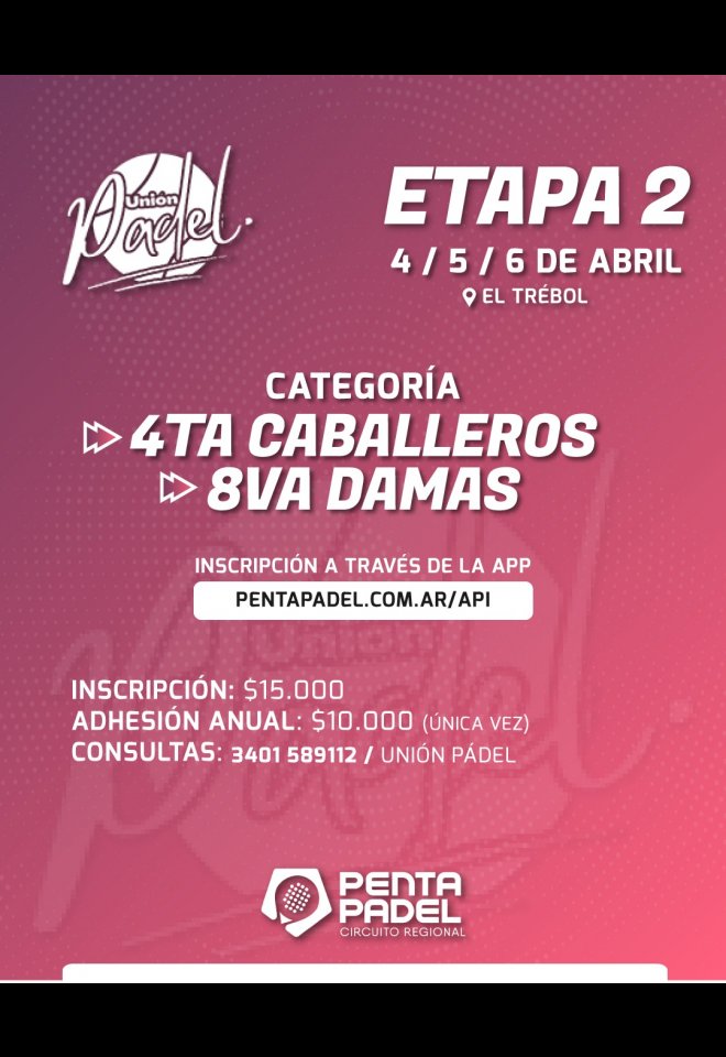»» Evento: 4TA CAB - 8VA DAM / 4-5-6 ABRIL / UNION PADEL / ETAPA 2 »» Localidad: El Trébol »» Fechas: 04/04/2025 al 06/04/2025