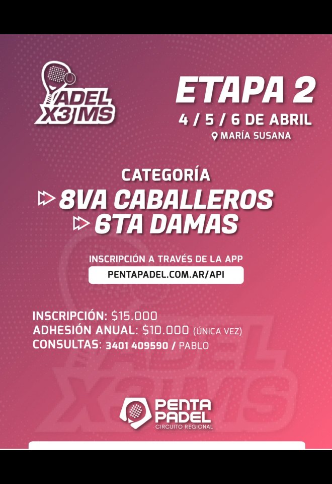 »» Evento: 8VA CAB - 6TA DAM / 4-5-6 ABRIL / PADEL X3 MS / ETAPA 2 »» Localidad: María Susana »» Fechas: 04/04/2025 al 06/04/2025