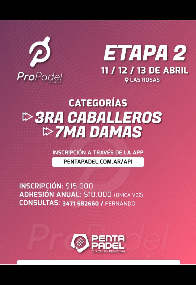 »» Evento: 7MA DAM - 3RA CAB / 10-11-12-13 ABRIL / PRO PADEL / ETAPA 2 »» Localidad: Las Rosas »» Fechas: 10/04/2025 al 13/04/2025