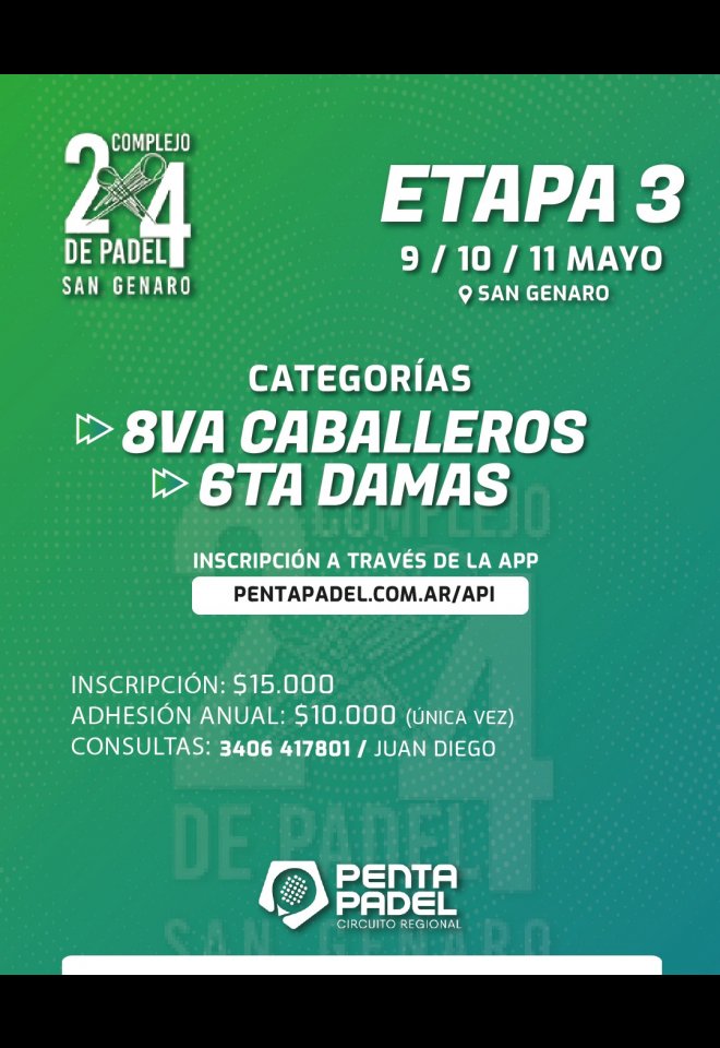 »» Evento: 8VA CAB-6TA DAM / 9-10-11 MAYO / 2X4 PADEL / ETAPA 3 »» Localidad: San Genaro »» Fechas: 09/05/2025 al 11/05/2025