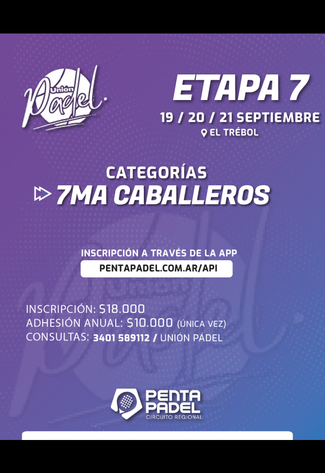»» Evento: 7MA CAB / 19-20-21 SEPTIEMBRE / ETAPA 7 / UNION PADEL »» Localidad: El Trébol »» Fechas: 19/09/2025 al 26/09/2025